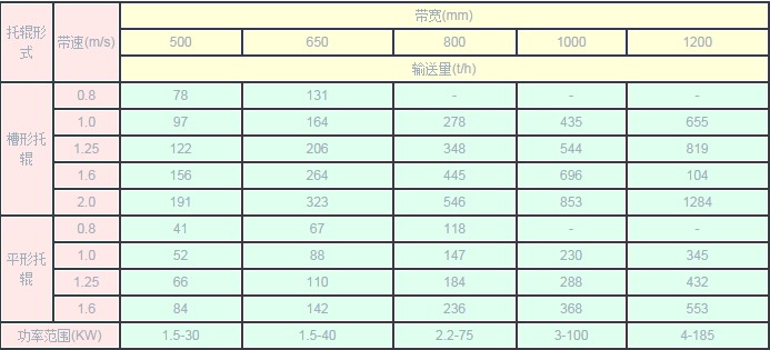 TD75型可輸送堆積比重1.0—2.5噸/米3的各種散狀物品,本廠生產帶寬500、650、800、1000等規格,傳動功率從1.5KW到185KW。帶速有0.8、1.0、1.25、1.65、2.0米/秒五種。最大輸送量見下表。